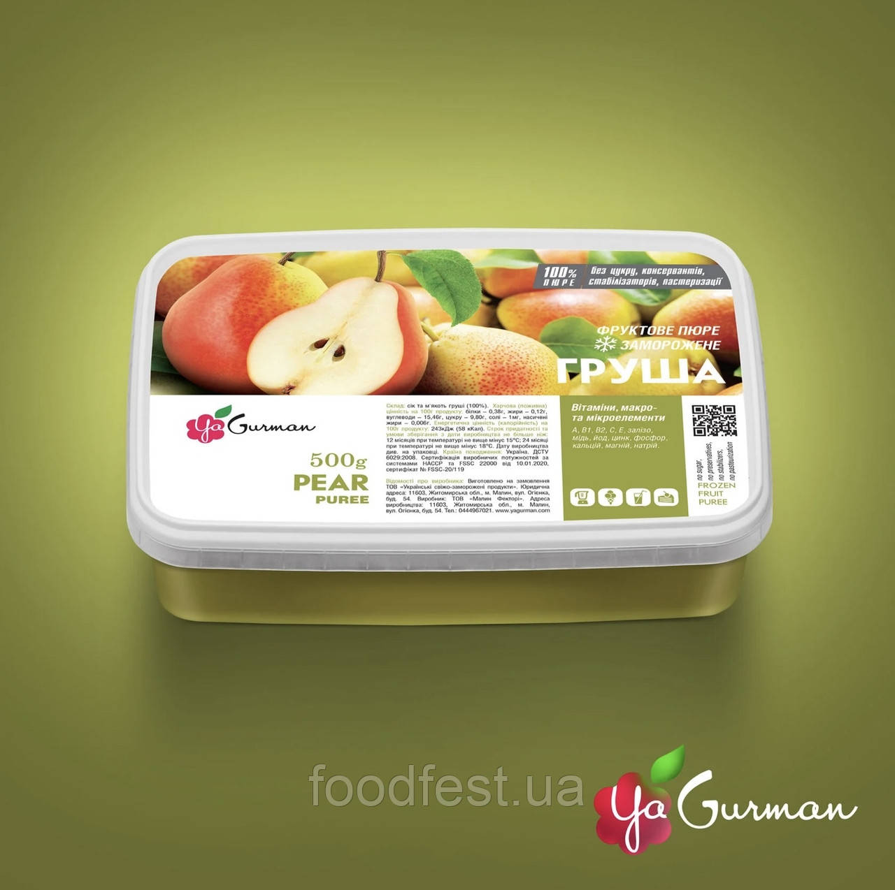 Фруктове пюре з м'якоті груші. Максимально зберігає аромат, смак і всі корисні речовини, що знаходяться в них. Пюре однорідне, без залишків будь-яких сторонніх домішок. Має типовий грушевий аромат. Для того, щоб зберегти плоди на піку своєї свіжості, процес заморожування та пакування продукції відбувається в безпосередній близькості від району зростання.